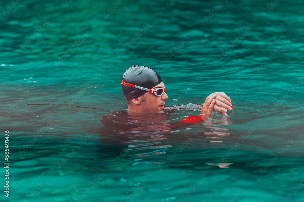 A triathlete in a professional swimming suit trains on the river while preparing for Olympic swimming