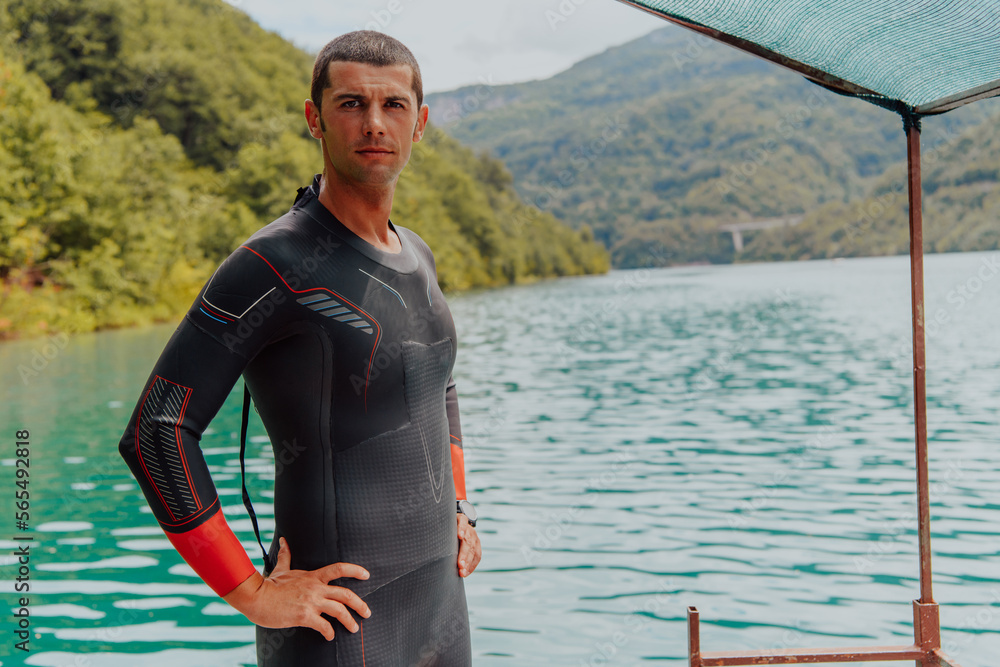 Athlete putting on a swimming suit and preparing for triathlon swimming and training in the river surrounded by natural greenery