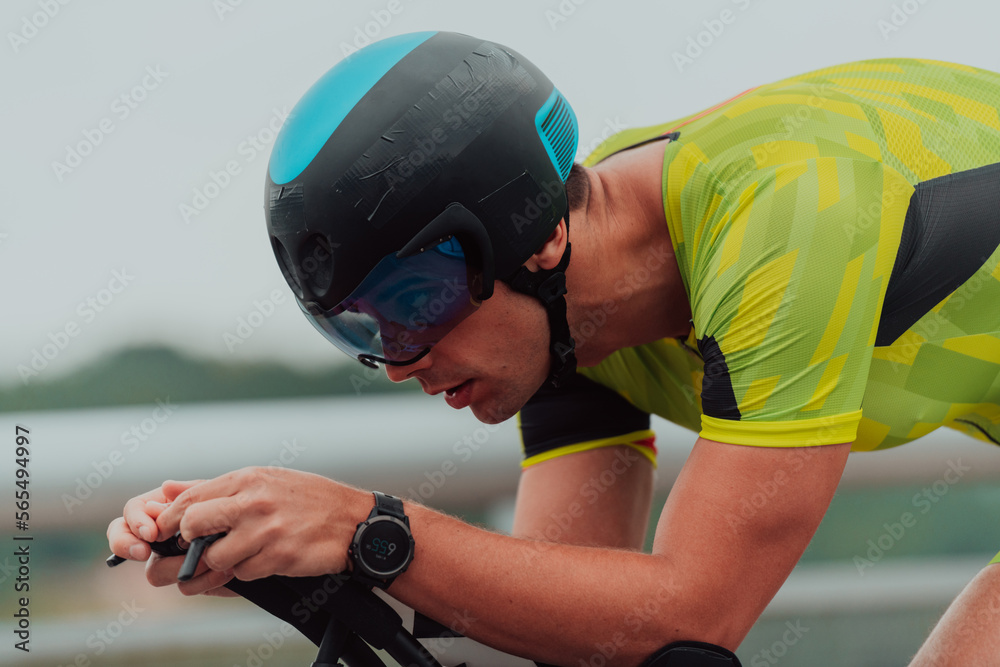 Close up photo of an active triathlete in sportswear and with a protective helmet riding a bicycle. Selective focus
