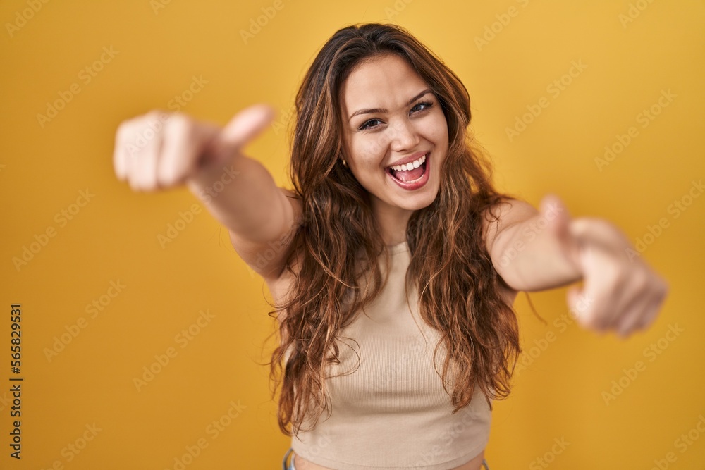 Young hispanic woman standing over yellow background approving doing positive gesture with hand, thumbs up smiling and happy for success. winner gesture.