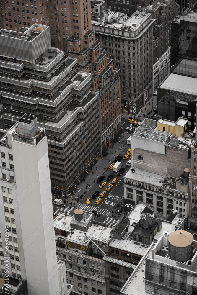 Häuserschlucht in Großstadt New York, Manhattan, mit Straße und Taxi von oben.