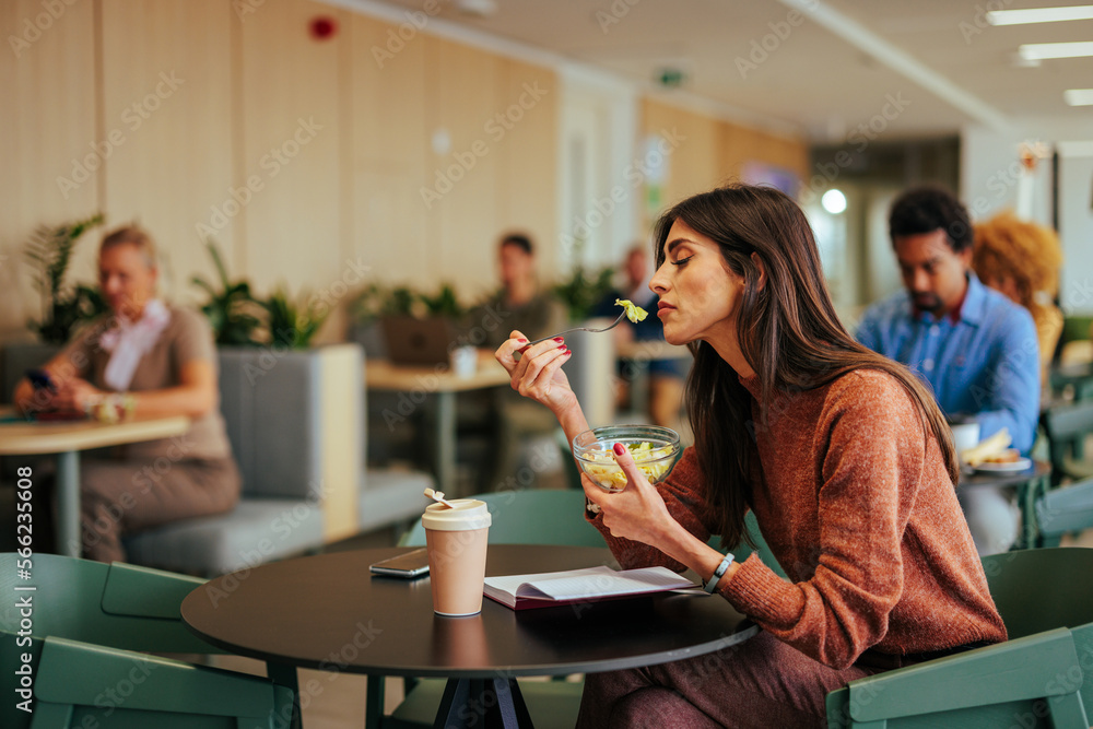 Businesswoman eating lunch in company cafeteria.