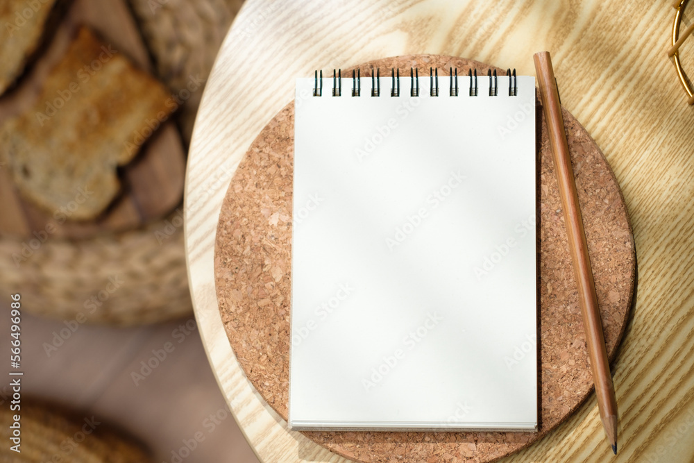 mockup blank sprial notebook top view on wood table with morning sunlight