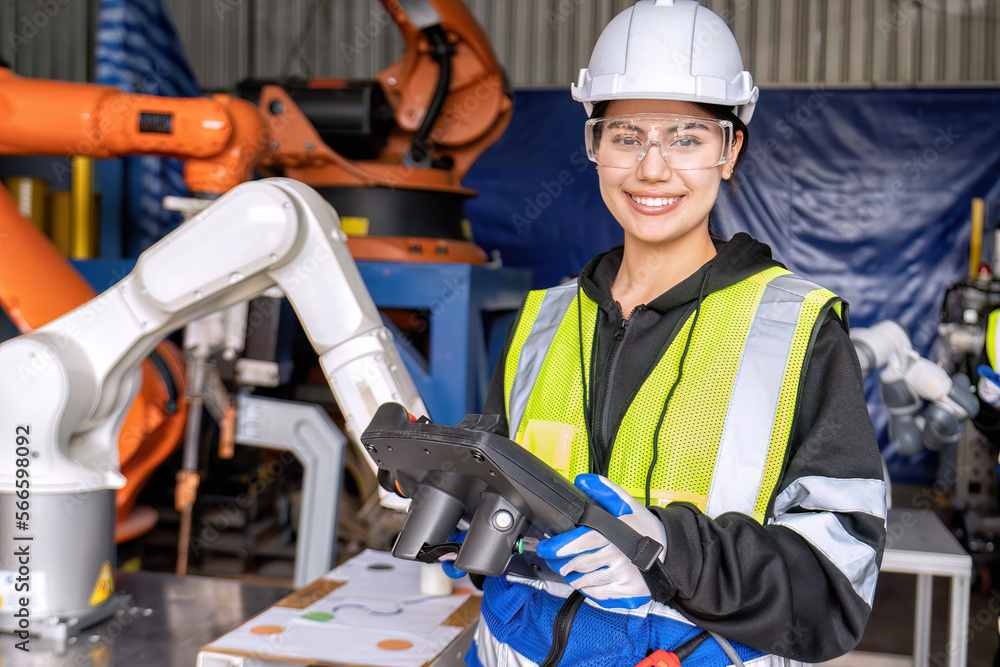 Young female asian service engineer holding robot controller operate robot arm automation factory