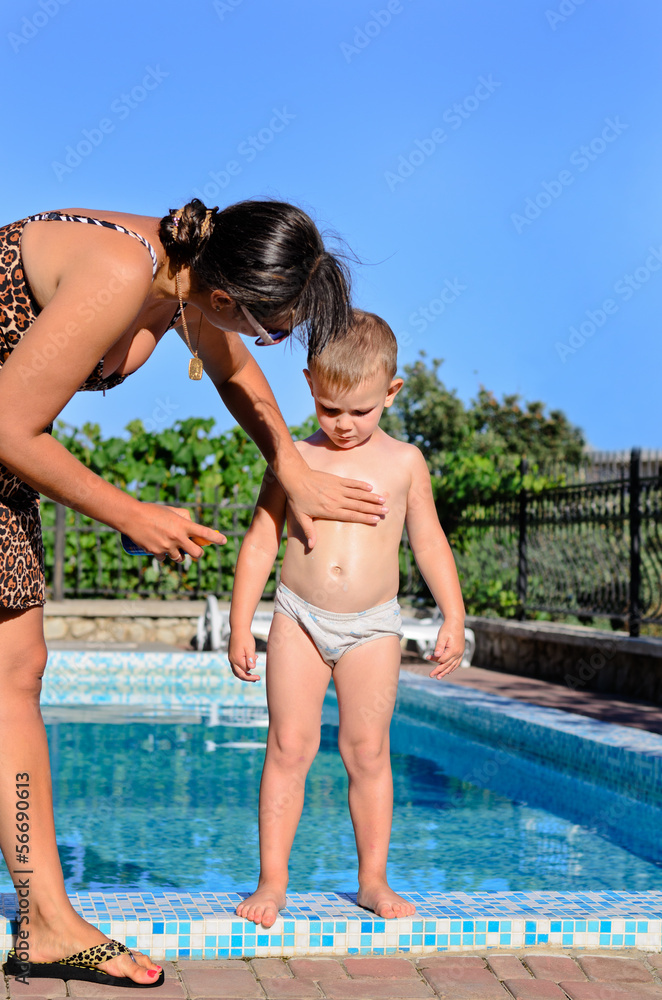 Young mother applying sunscreen to her son