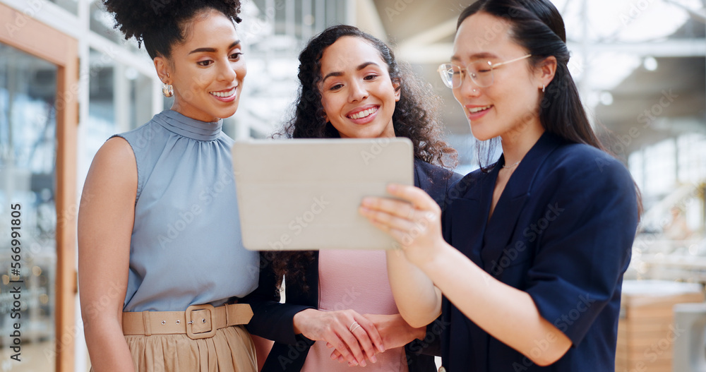 Tablet, collaboration and business women with teamwork marketing strategy and website planning. Digital technology, diversity and creative employees review new design, feedback or ideas communication