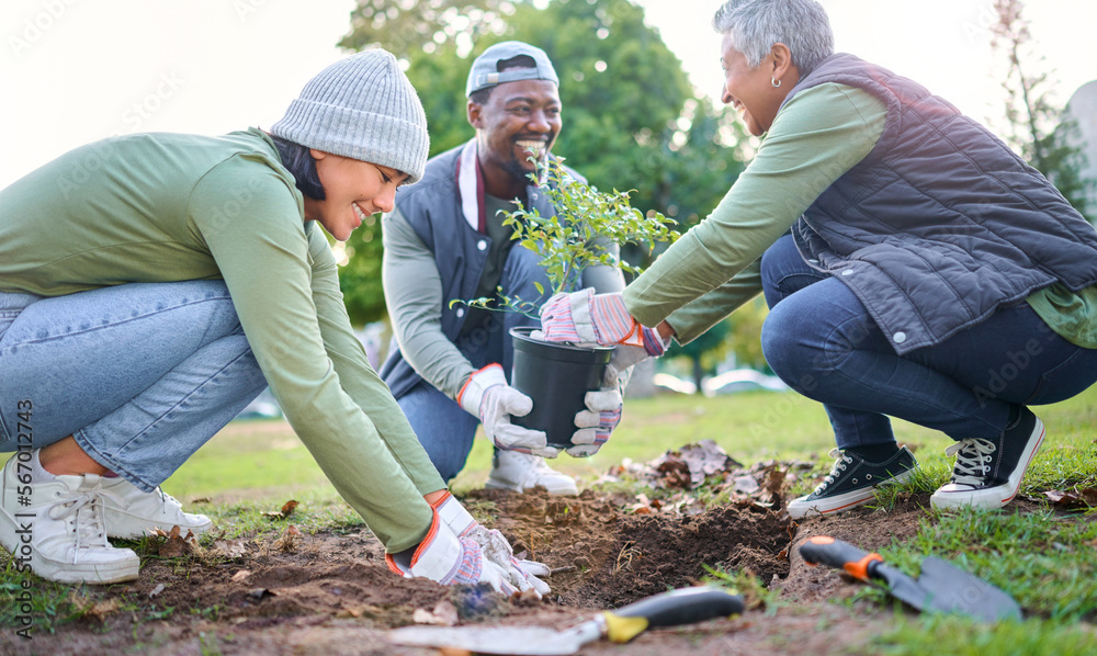 Tree planting, community service and volunteering group in park, garden and nature for sustainable environment. Climate change, soil gardening and earth day project for growth, care and green ecology