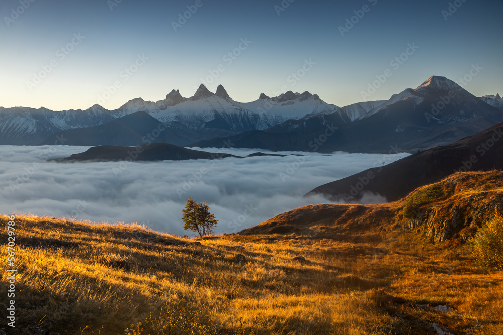 Lever du soleil au Lac Guichard avec les Aiguilles d' Arves , Paysage du Massif des Grandes Rousses à l' automne , Savoie , Alpes France.