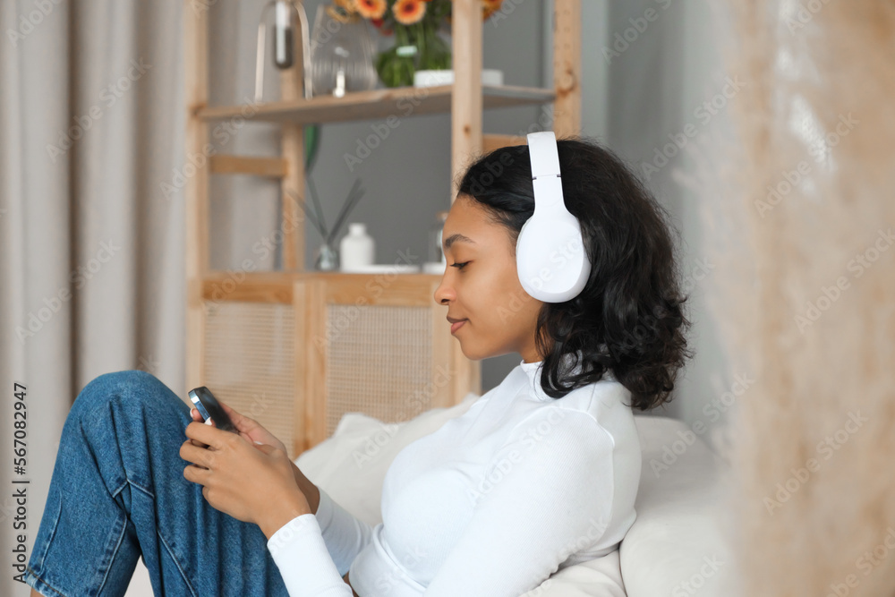 Side view portrait of a happy african amercian girl listening music,podcast or lecture on sofa at home with phone in her hands. Online application and modern technologies concept.