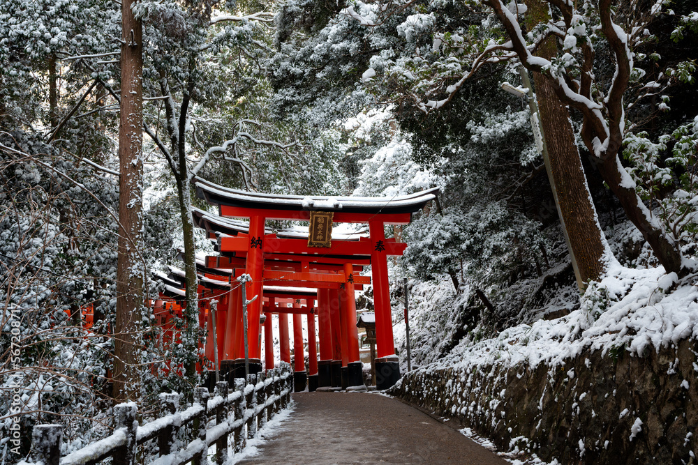 Snow-capped row of red torii gates at Fushimi Inari-taisha Shrine in winter. Kyoto, Japan.