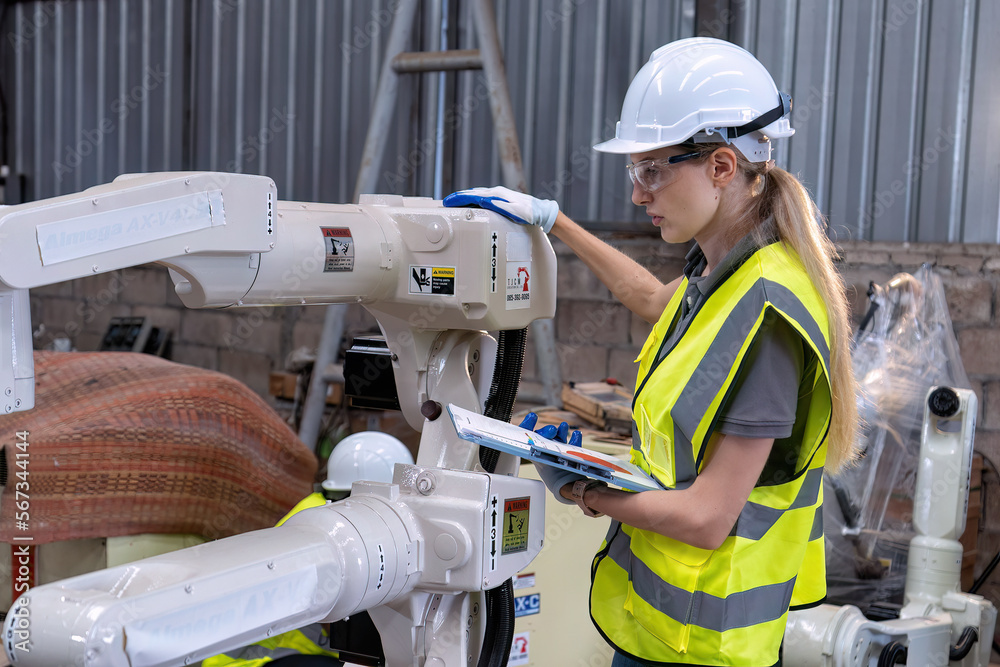 In robotic maintenance shop engineer busy commissioning and operate robot arm after programming