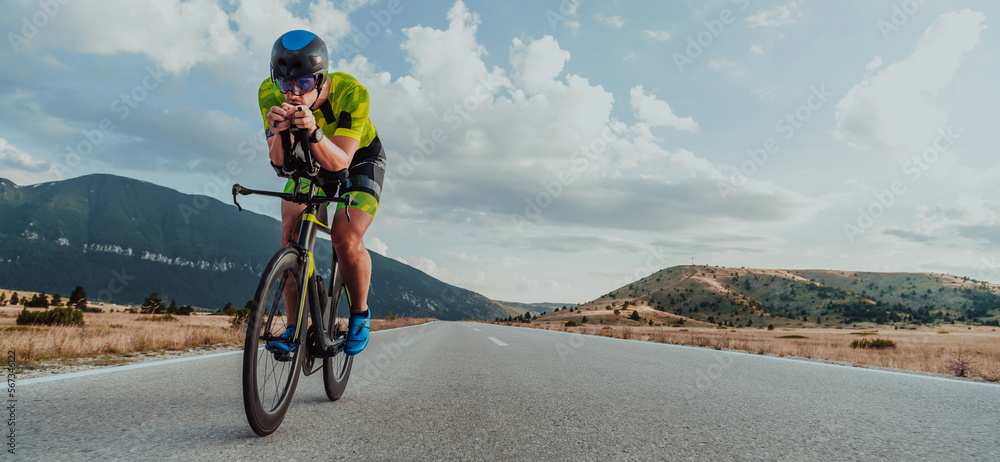 Full length portrait of an active triathlete in sportswear and with a protective helmet riding a bicycle. Selective focus