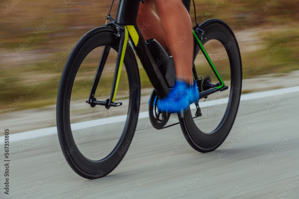 Close up photo of an active triathlete in sportswear and with a protective helmet riding a bicycle. Selective focus