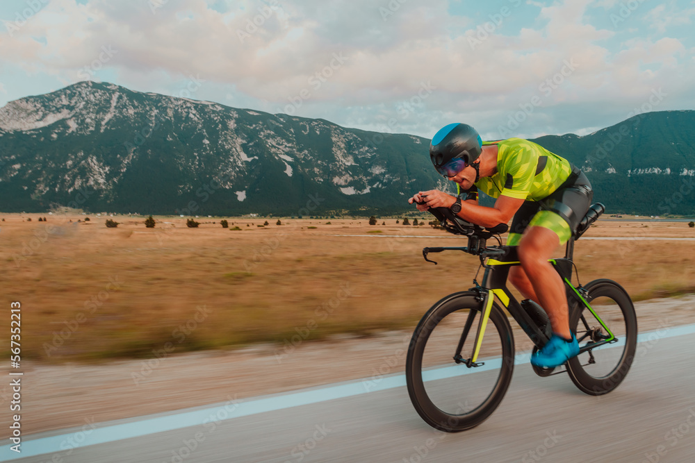 Full length portrait of an active triathlete in sportswear and with a protective helmet riding a bicycle. Selective focus