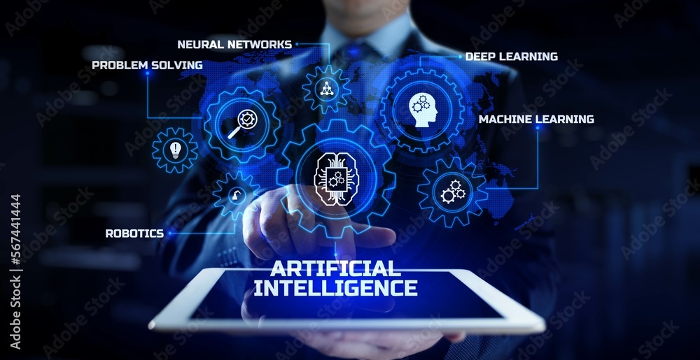AI Artificial intelligence Neural network Machine learning modern technology concept. Businessman pressing button on screen.