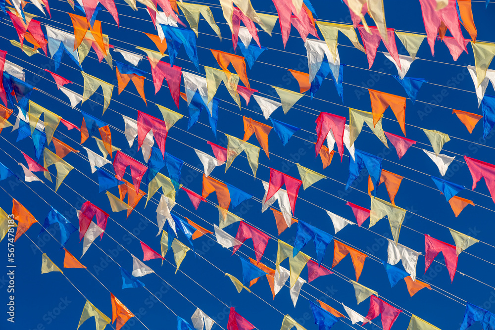 Colorful decorative flags of the June festival with blue sky in the background in the city of Ilhabela, north coast of the state of Sao Paulo, Brazil
