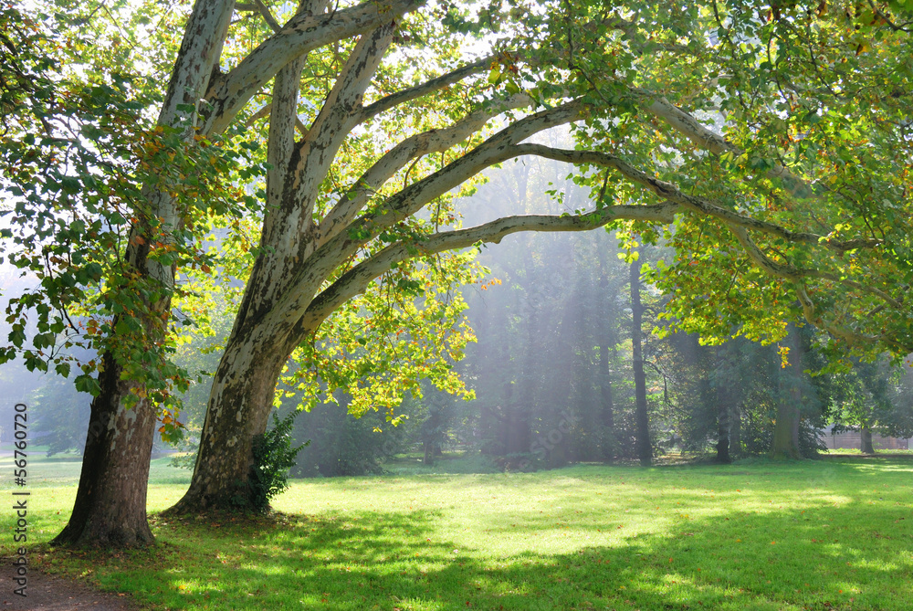 Green plane trees and sunshine rays in the background