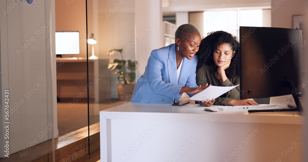 Business woman coaching worker at night modern office, planning documents research and company strategy. Female team employees working overtime on report collaboration, idea analysis and conversation