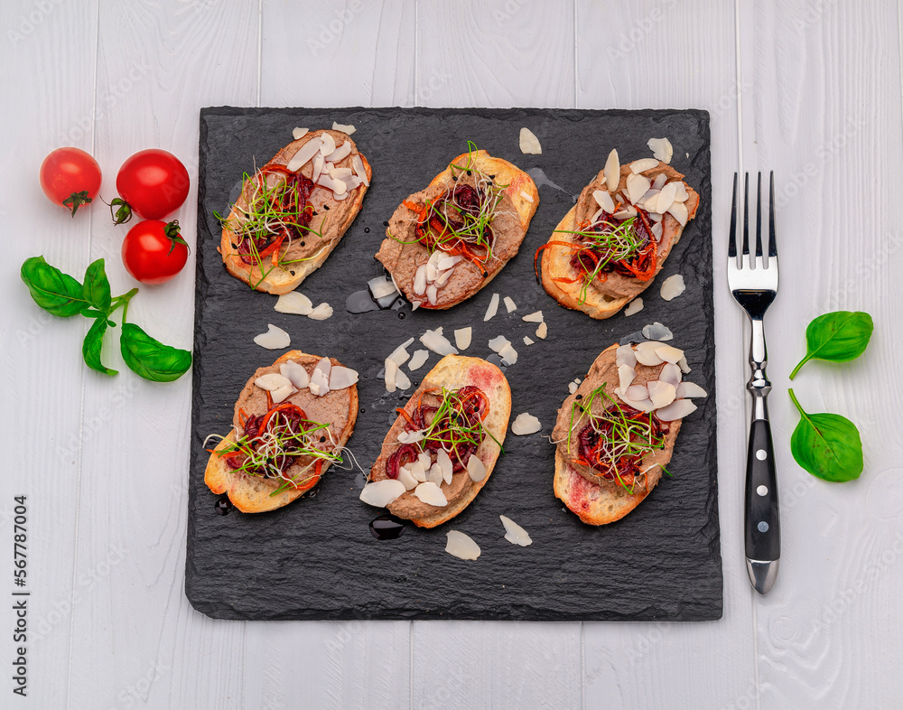 Bruschetta with pate and caramelized onions on a stone board