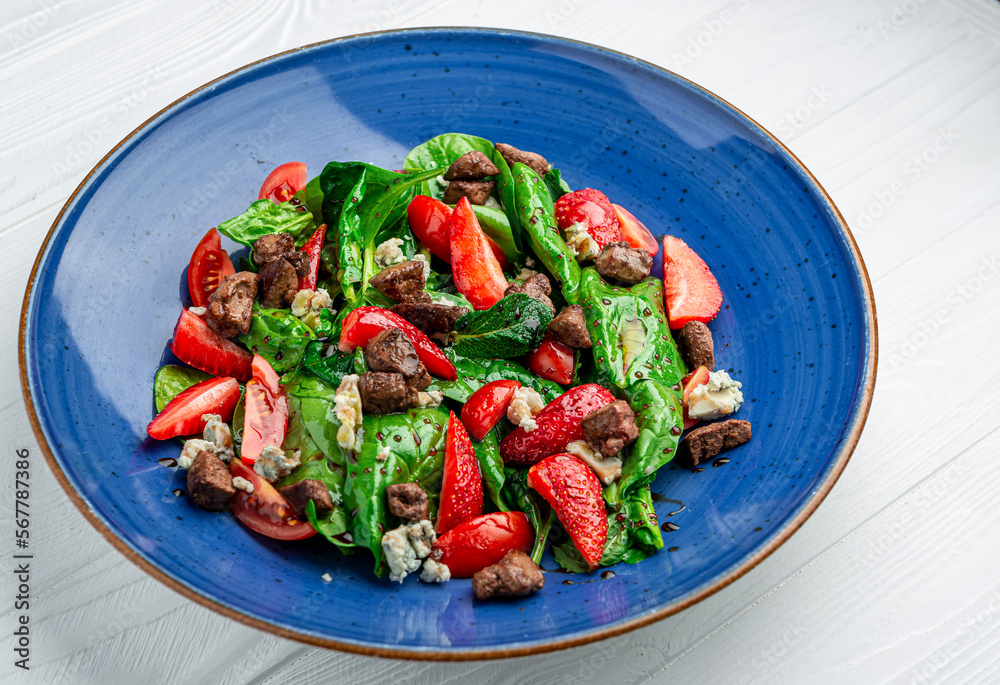Salad with fried duck liver, brie cheese, strawberries, tomatoes and spinach leaves