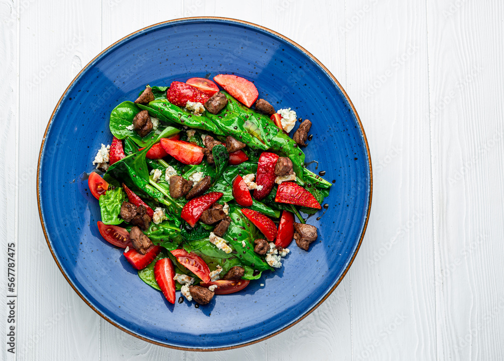 Salad with fried duck liver, brie cheese, strawberries, tomatoes and spinach leaves