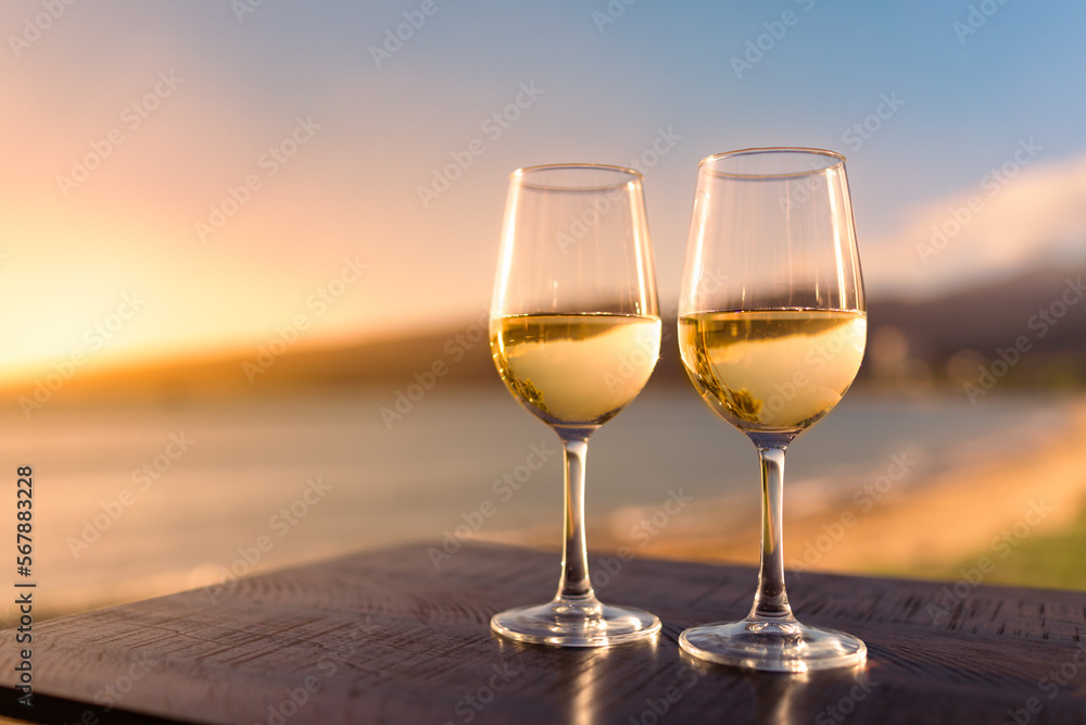 Romantic summertime lifestyle beach side getaway for two. Pair of wine glasses and tropical ocean view