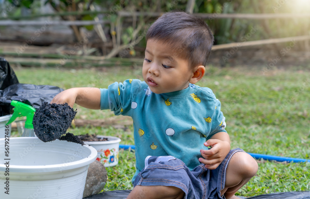 Little child shovels soil into pots to prepare plants for planting. Toddler boy digging soil for planting to Mother's little helper. Gardening. Hobbies at home horticulture. Leisure activities concept