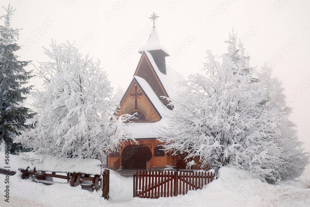 Beautiful wooden Chapel st. Brother Albert in Zakopane (Furmanowa) in winter scenery, Poland