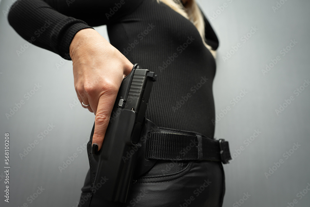 The girl pulls out a gun from the holster, close-up photo.