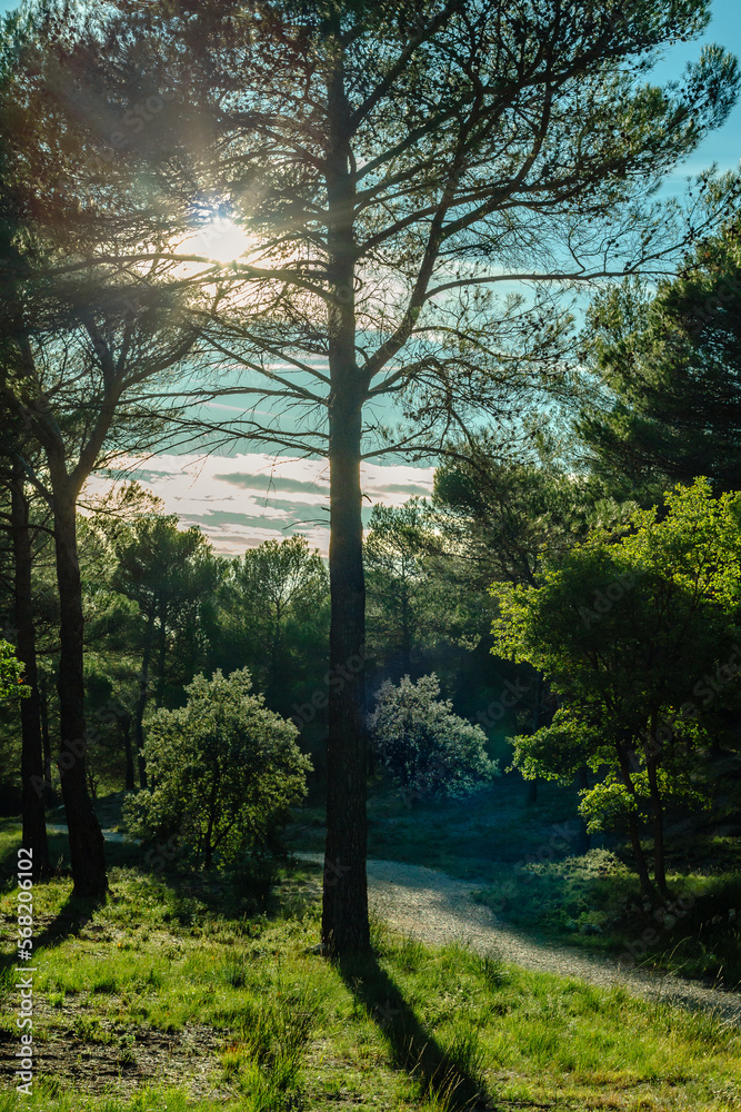 Backlight beautiful scene in the Luberon Massif (mountains) with trees, green grass and a walking path. Romantic French scene in nature. Cheval Blanc, France.