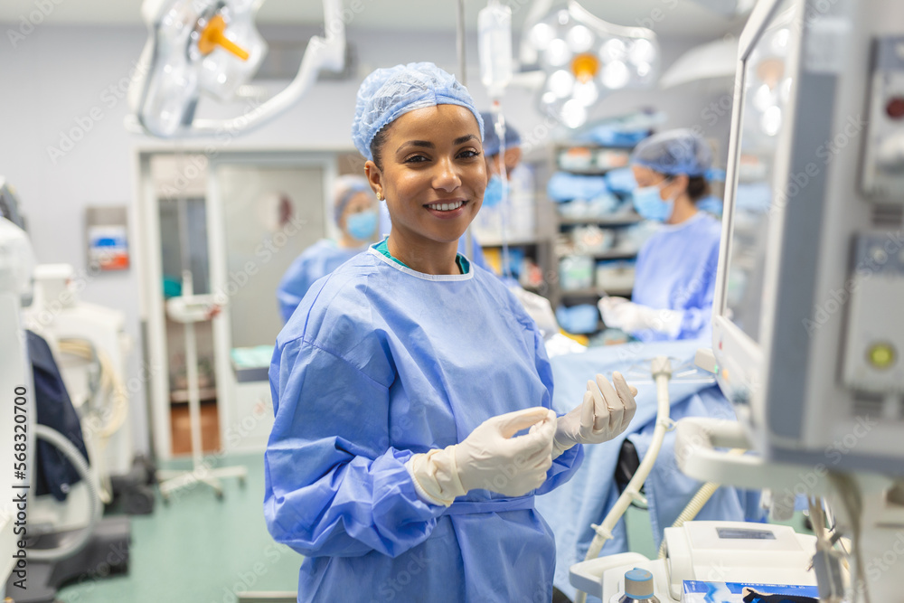 Portrait of a young female doctor in scrubs and a protective face mask preparing an anesthesia machine before an operation