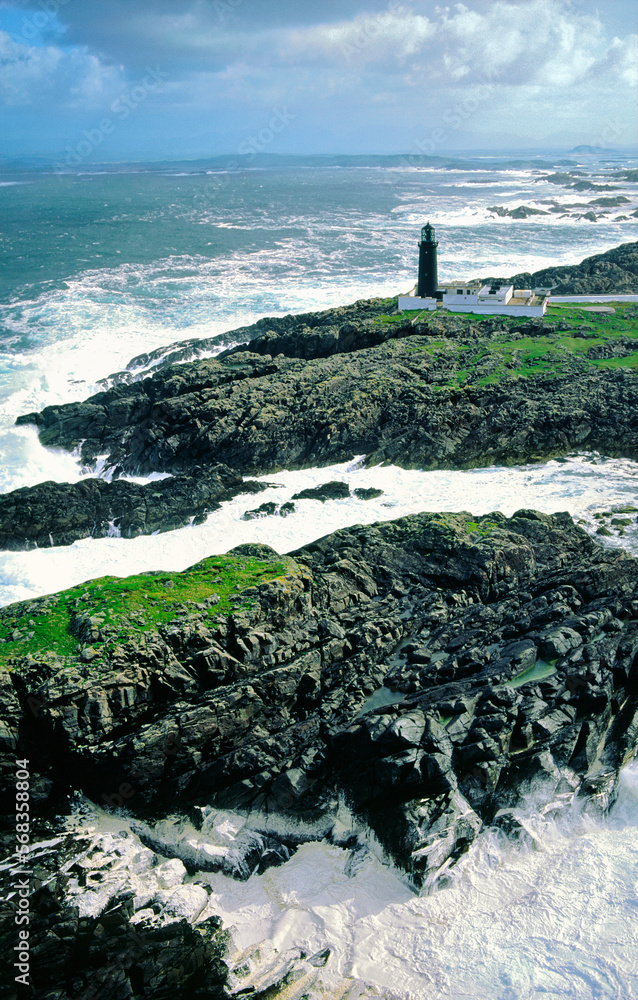 Stormy Atlantic weather. Slyne Head lighthouse marks the treacherous rocks of at southwest tip of Connemara, County Galway, Ireland. Aerial