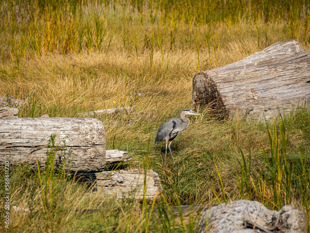 one great blue heron resting at a grassy wetland surrounded by drift wood on a sunny day.