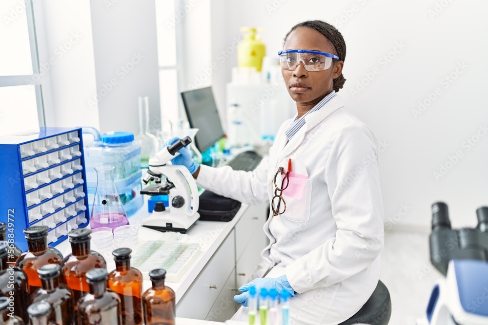 African woman working at scientist laboratory thinking attitude and sober expression looking self confident