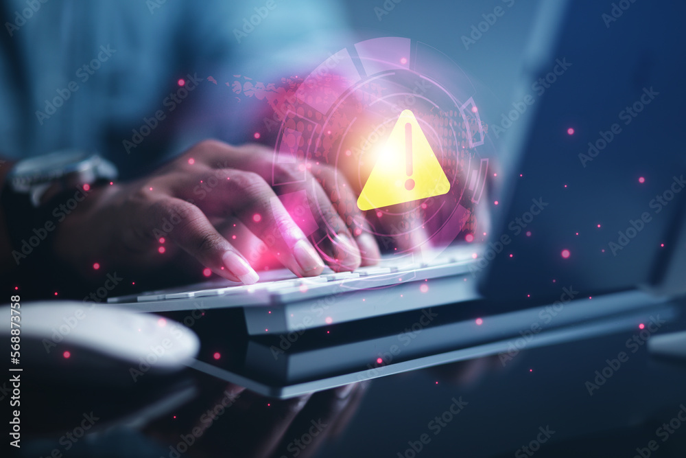 Businessman, programmer, developer using laptop computer with triangle warning sign for error notification. Failure data protection concept
