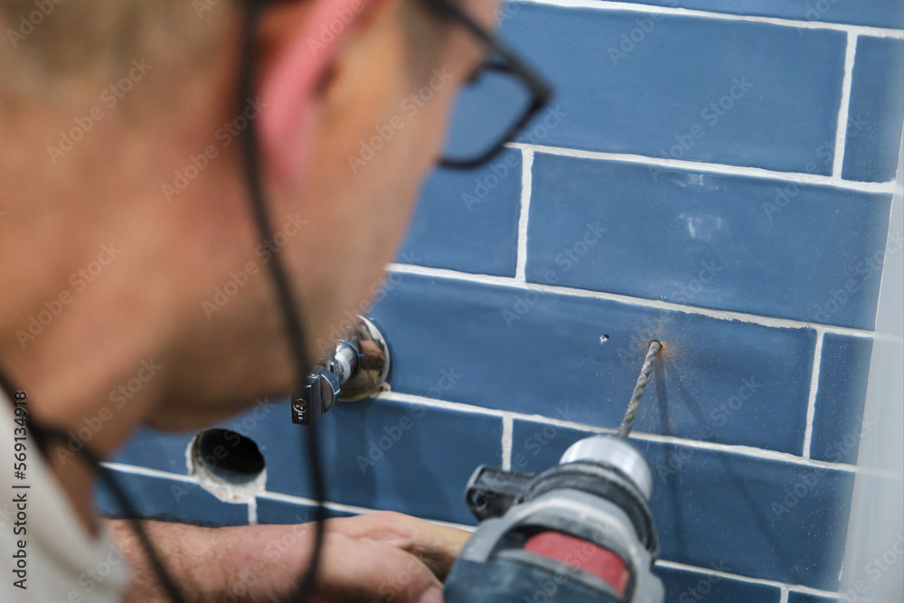 Unrecognizable senior mason drilling of a hole in the wall of blue tiles.