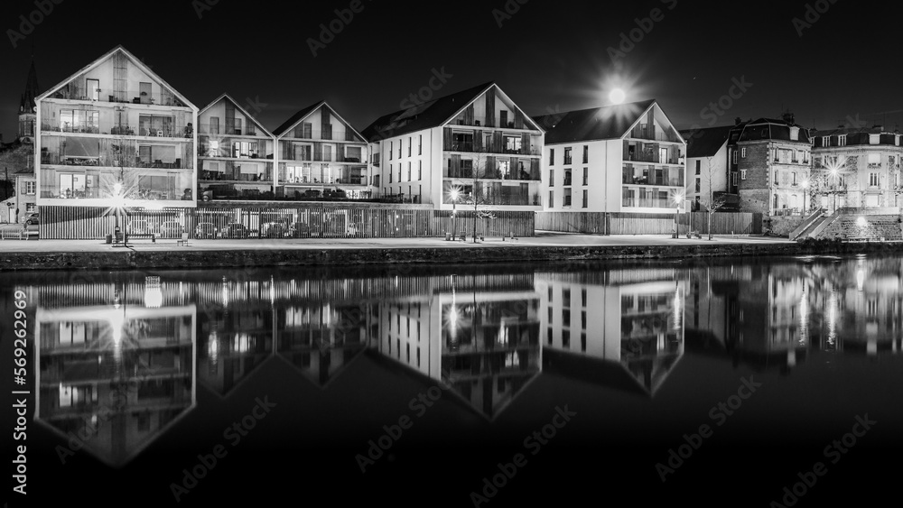 Reflets sur la rivière Aisne à Soissons en noir et blanc