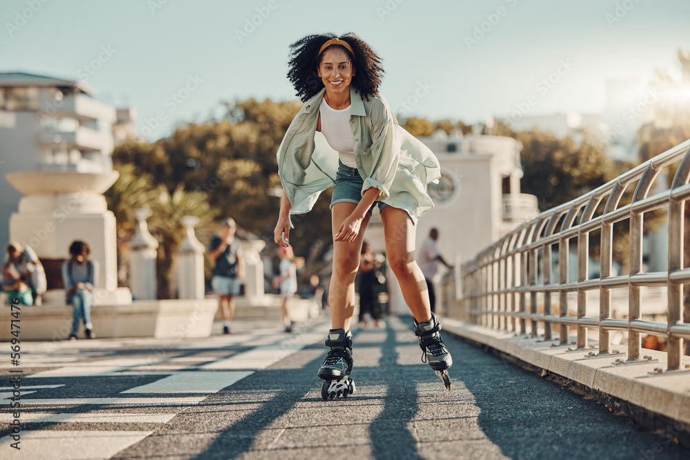 Exercise, city and black woman roller skating for fitness, health and wellness outdoors. Sports practice, training and portrait of happy female skater in street, having fun and enjoying exercising.