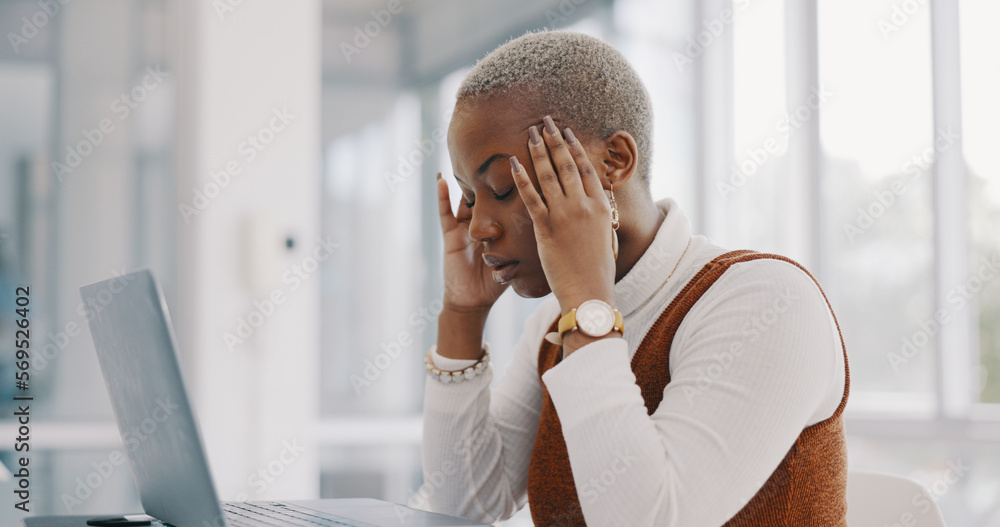 Stress, burnout and headache of black woman on laptop typing email in office at marketing company. Anxiety, tired and migraine of employee frustrated thinking of professional online response.