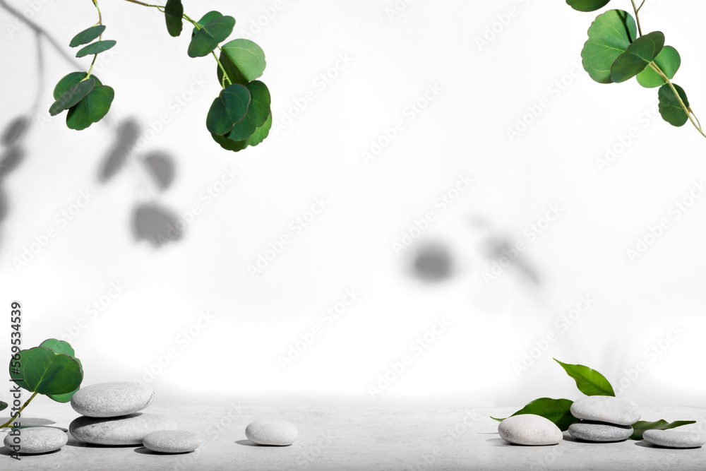 White background with green plants and natural stones