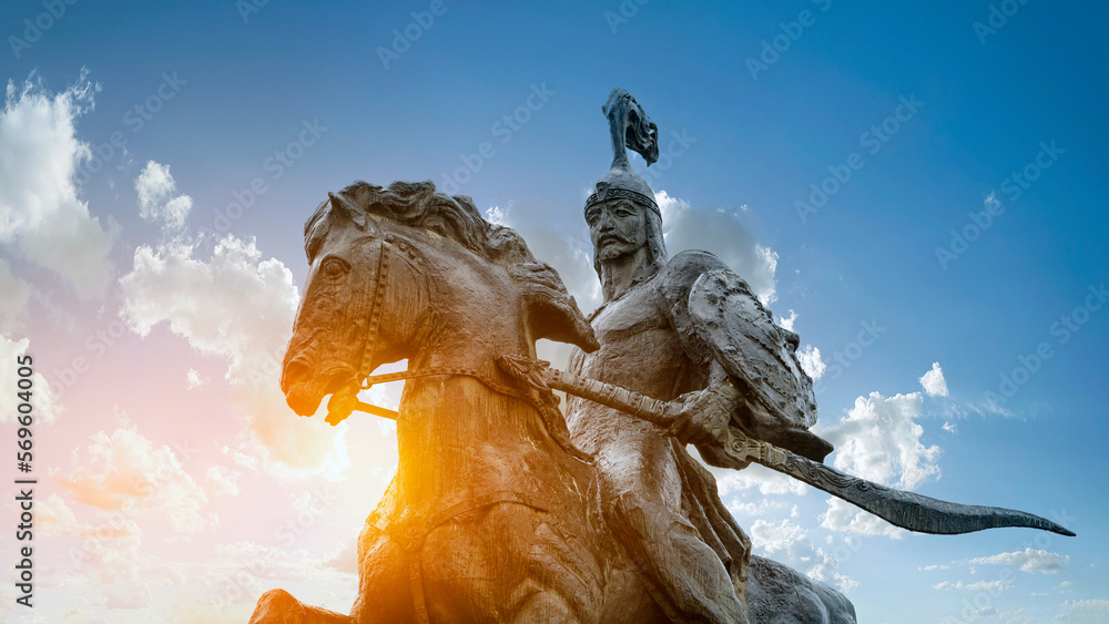 Statue of the hero Manas representing the epic of Manas against the background of the sky of Kyrgyzstan on Alatau Square in Bishkek KYRGYZSTAN