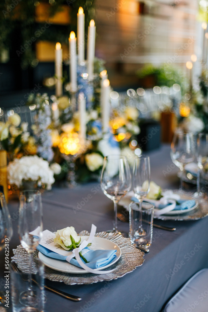 Close-up of a festive table setting. Silver plate decorated with a blue napkin and white natural roses on a gray tablecloth. Wedding decoration concept