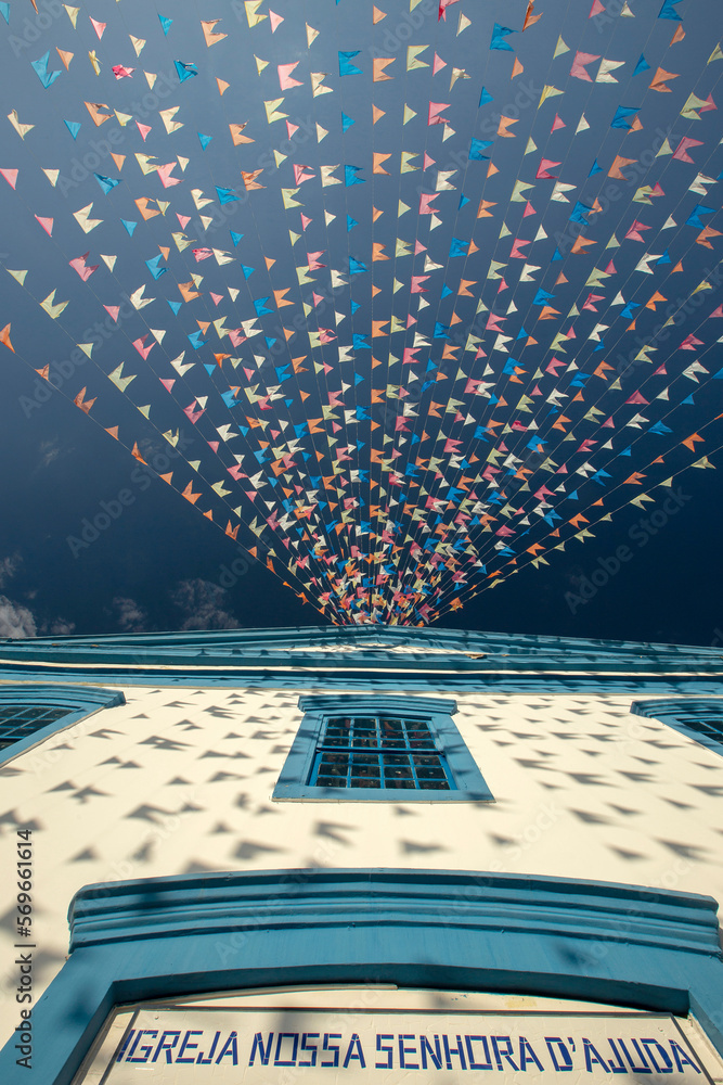 Church of Our Lady of Help, or Nossa Senhora d Ajuda in portuguese, decorated with June festival flags. Ilhabela, colonial town on the coast of Sao Paulo state, Brazil