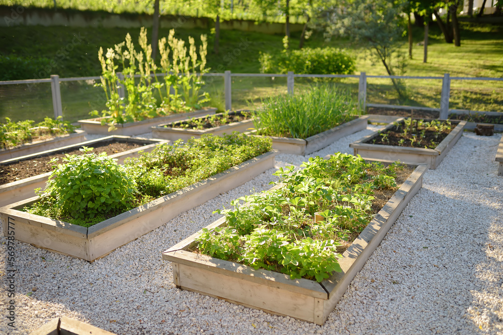 Community kitchen garden. Raised garden beds with plants in vegetable community garden. Lessons of gardening for kids.