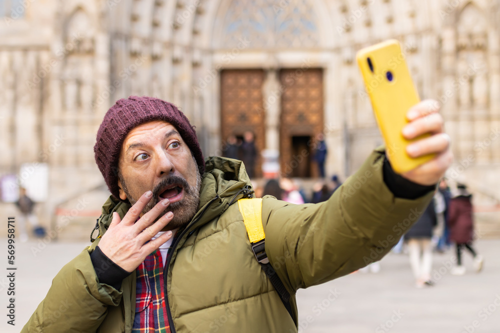Expressive man taking a selfie on smartphone in front of the Cathedral of Barcelona (Spain).
