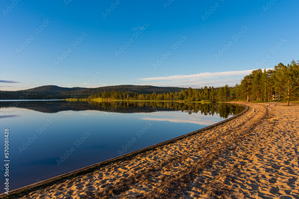 Peaceful landscape of Lake Inari with the midnight sun in Lapland, Finland