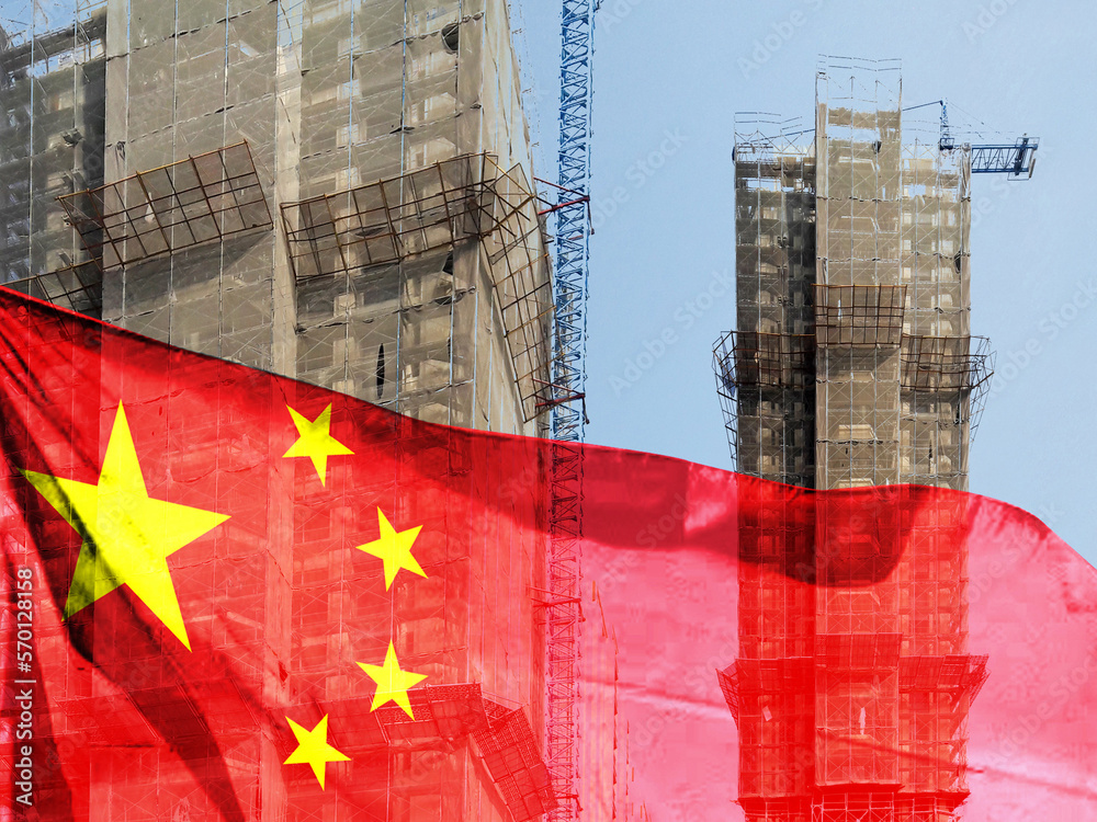 Double exposure creative hologram of unfinished supertall building and Chinese flag