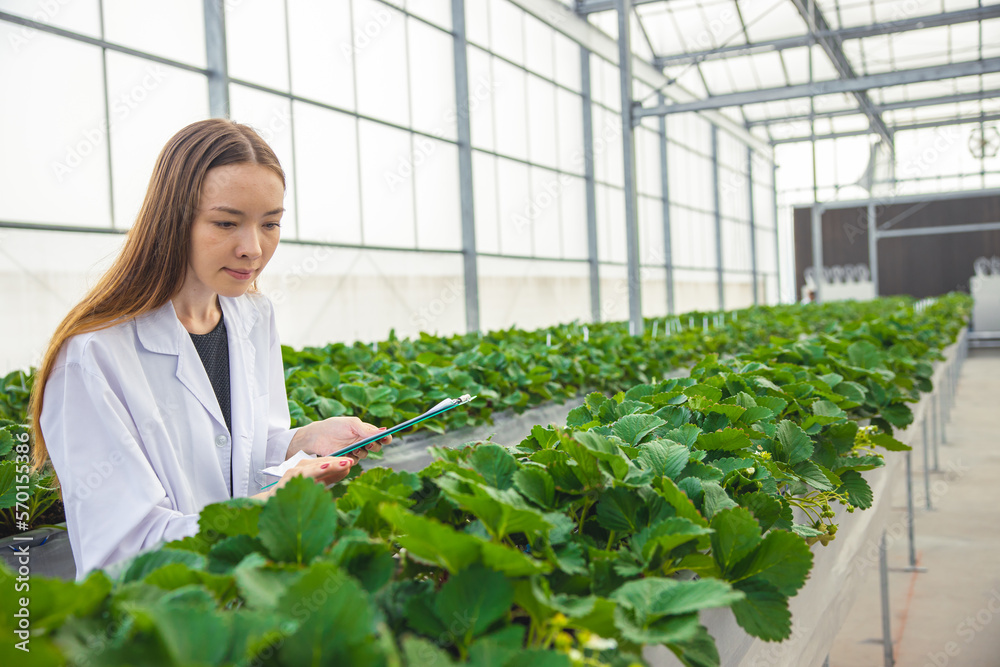 agriculture scientist in greenhouse organic strawberry farm for plant research smart working woman.