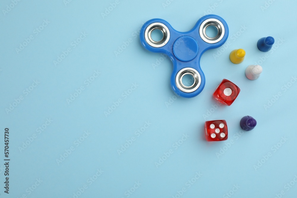 Spinner, dices and pawns on light blue background, flat lay with space for text. Board games components