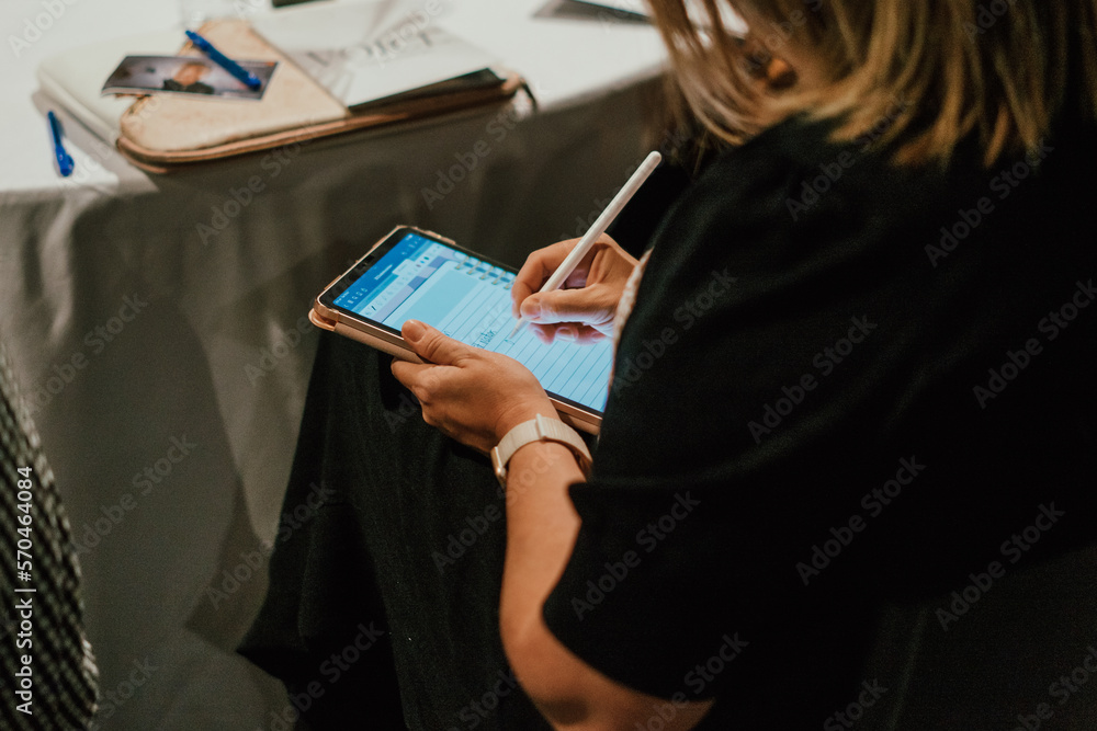 Close-up on a business woman writing notes on a tablet during a work conference.